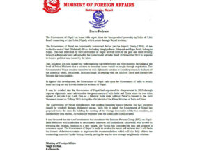“This was reiterated by the Government of Nepal several times in the past and most recently through a diplomatic note addressed to the Government of India dated 20 November 2019 in response to the new political map issued by the latter,” the ministry stated in the press statement.