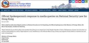 On June 3, 2020, Nepal’s Ministry of Foreign Affairs issued a statement saying that the country supports China’s efforts to maintain law and order in Hong Kong.